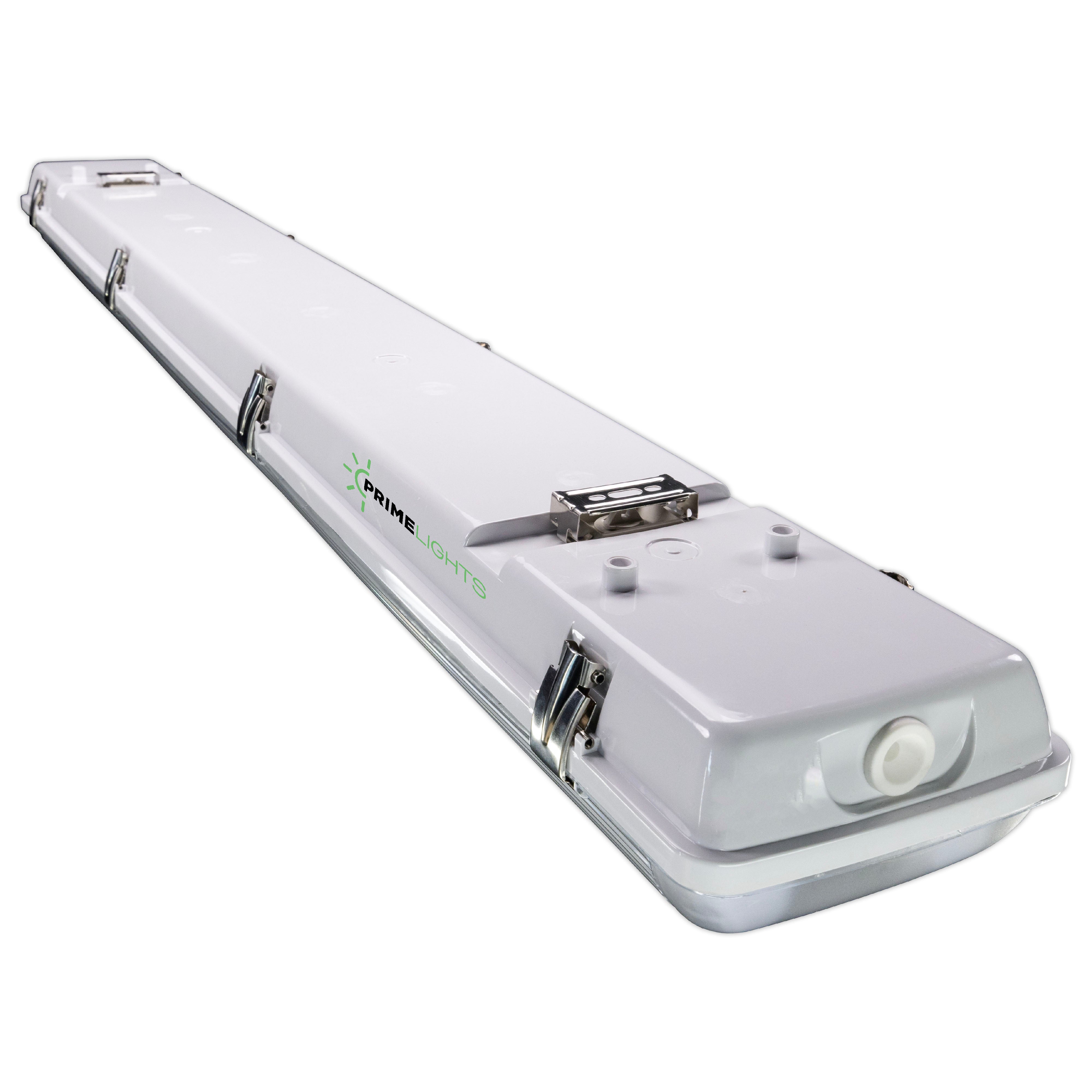 Lampholders wired, luminaire quick disconnects, unbreakable polycarbonate lens and housing, cold rolled steel gear tray in white reflective baked white enamel, safety straps connect gear tray to housing, 7/8'' plugged conduit knockouts on top and both ends, stainless steel latches, and mounting brackets.