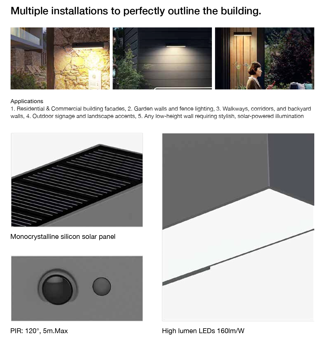 • Lighting Modes: M1 25% till dawn, M2 10% PIR (30s) till dawn, M3 0% PIR (30s) till dawn, M4 100% till dawn