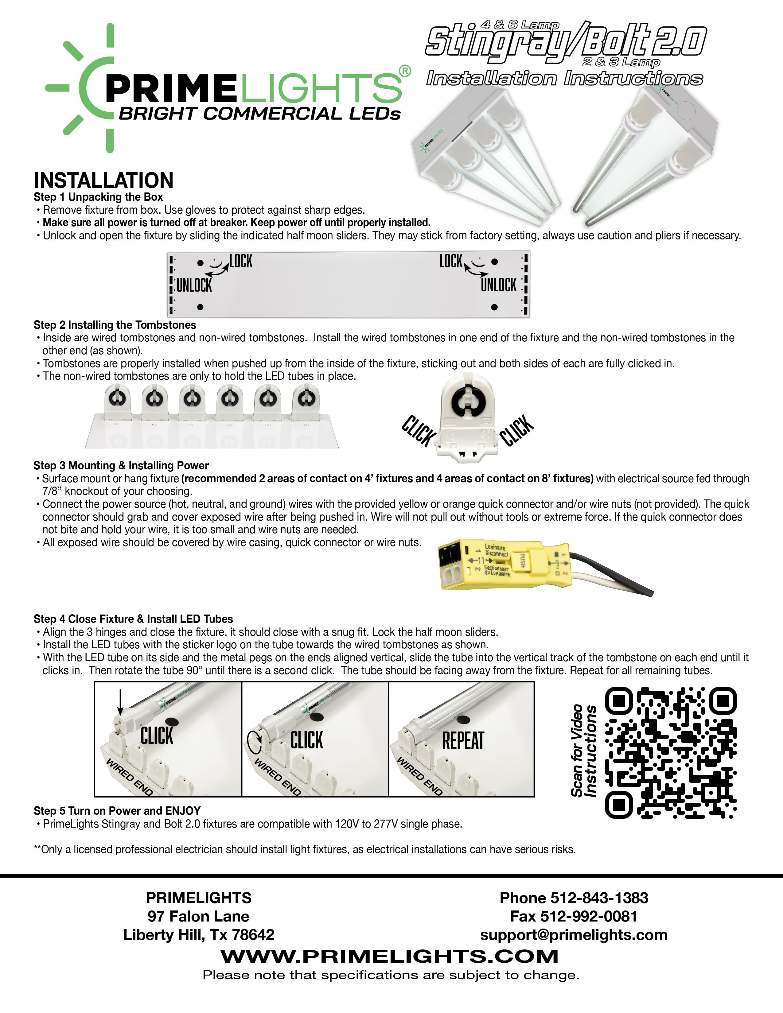 Specifications: Wired lamp holders, luminaire disconnect with 4 connection points for easy daisy chain, 20-gauge cold rolled steel in baked white enamel, 7/8'' conduit knockouts on both ends and top, mirrored aluminum reflector. Clear LED bulbs with internal drivers - no external drivers or ballasts to maintain. You will never have to change anything inside the fixture. PrimeLights® warranties every fixture and every bulb for 5 years. 110v,120v, 240v, 277v. Long lasting, durable, and bright.